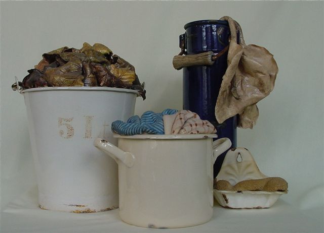 In a period in which art was not at all founded on realism, he produced deceivingly real enamel objects like pans, strainers, racks for spoons, coffejugs, which we all know from grandmother's kitchen.